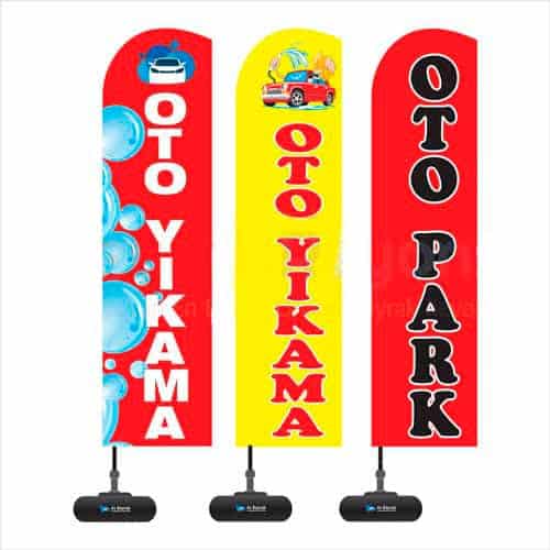 Ebatlar; 75×250 cm, 75×300 cm ve 100×400 cm olan boyutlarında olup, Bez Bayrağı, Direği ve Dubası veya Kauçuk ayaklı olarak üretimini yapmaktayız. Rüzgarla birlikte 360 derece hareket etme esnekliğine sahip olduğu için marka isminiz, logonuz veya sloganınız sürekli müşterilerin gözü önünde olmaktadır.